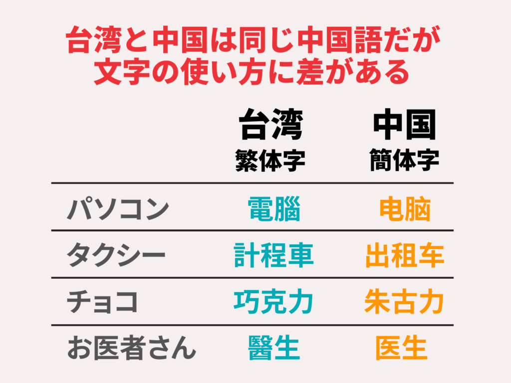 台湾は、中国本土で使われている簡体字とは異なる「繁体字」が使われています。